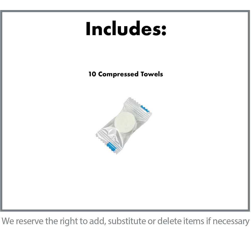 This Kit contains 10 compressed towels. Just add water and each wafer turns into a woven hand towel.