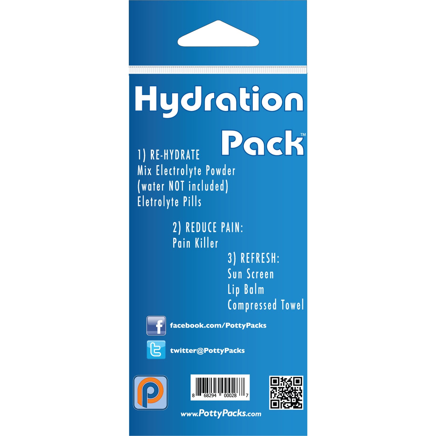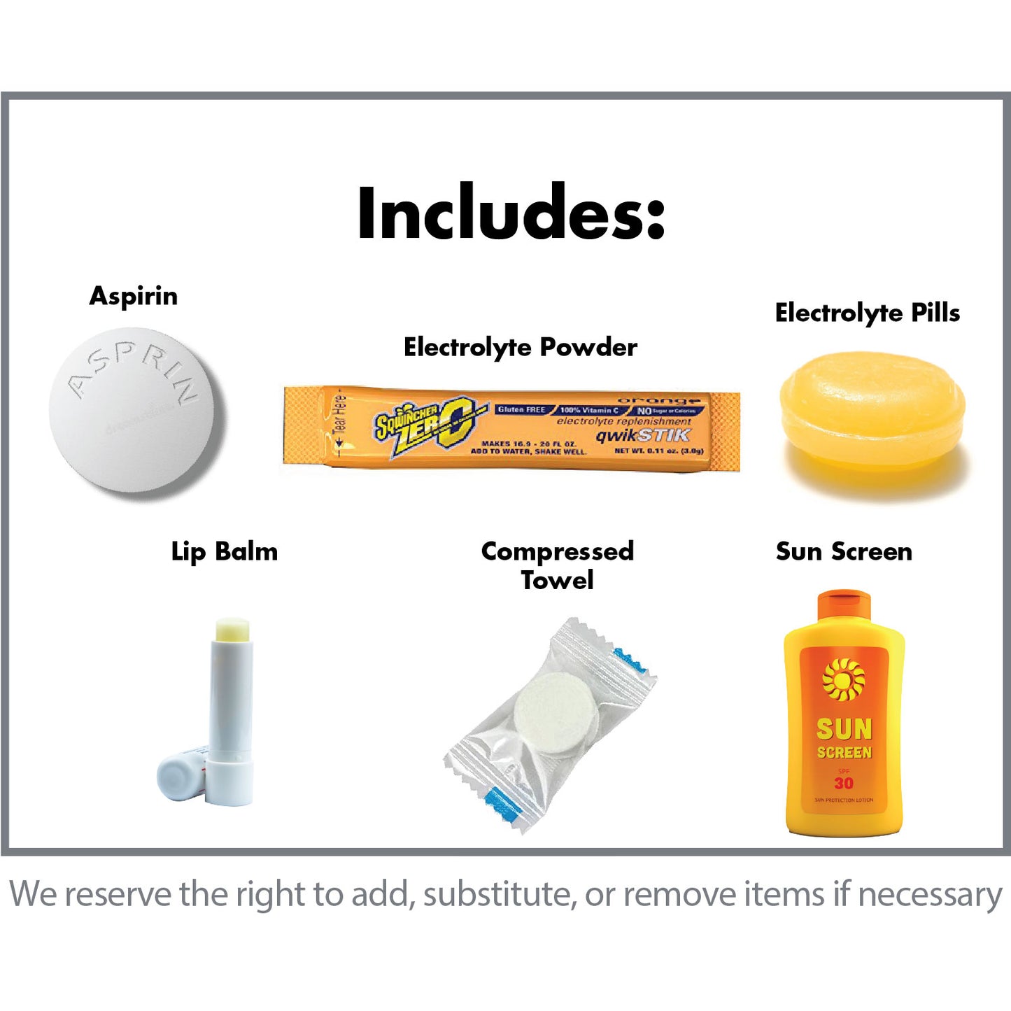 Recover Faster! This hydration pack includes everything but the water. Re-hydrate by mixing the electrolyte powder with water, and then use the electrolyte chew. Refresh by using the compressed towel, lip balm, and sun screen. Reduce blood pressure by using the aspirin.